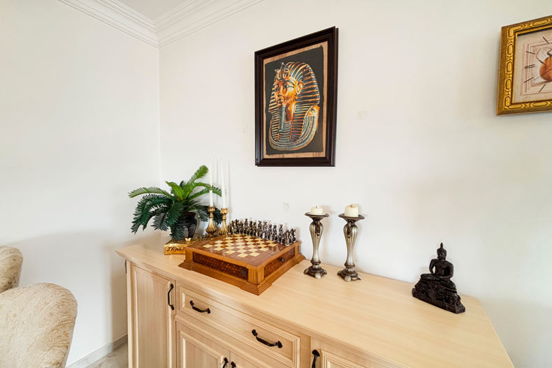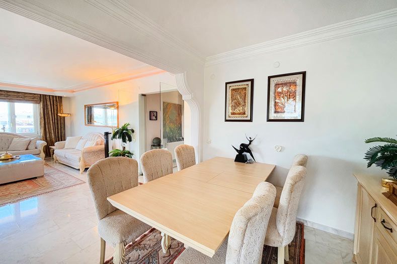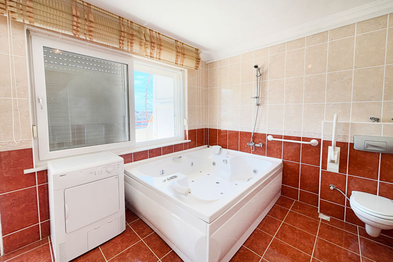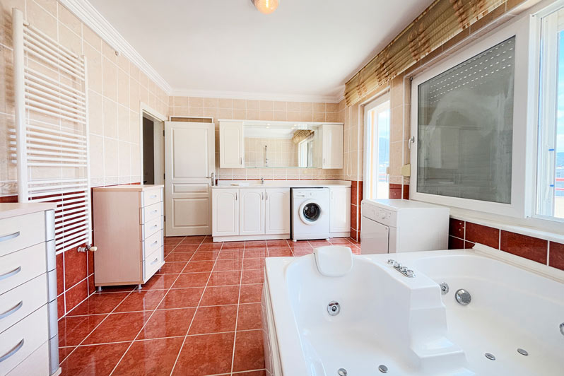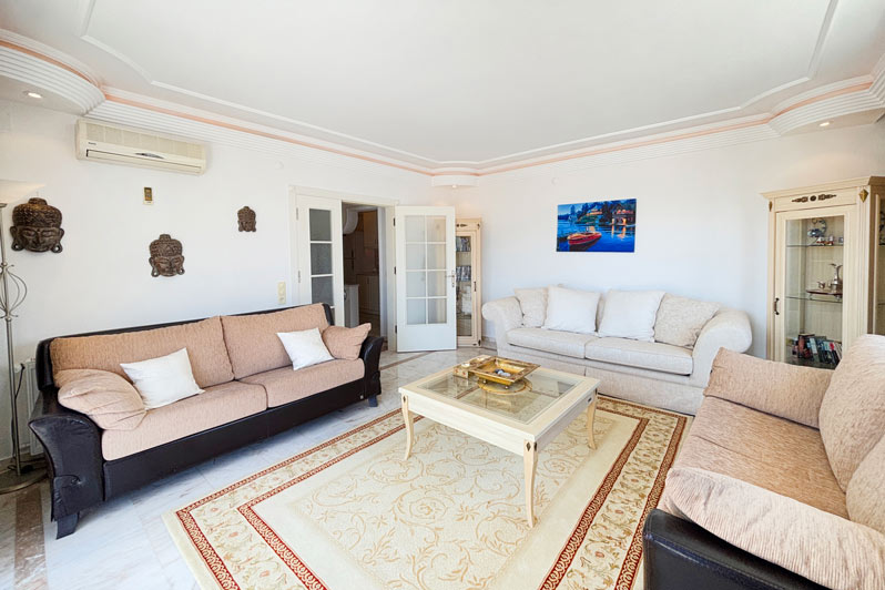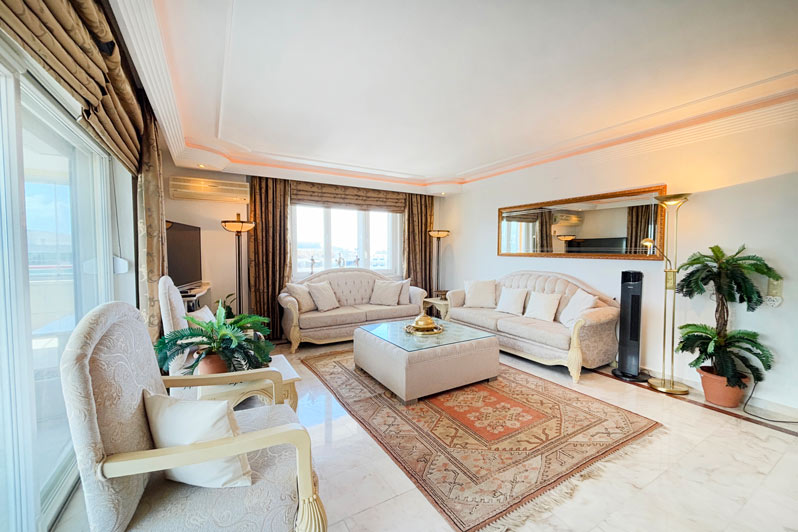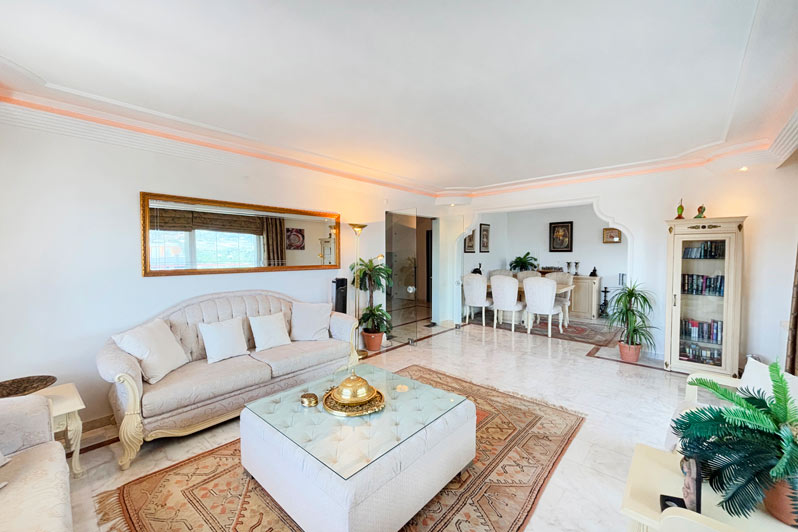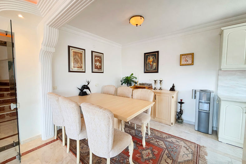 This beautiful property is fully furnished and has a traditional design, with 310m2 of light-filled space. The relaxing open-plan lounge area has a fabulous dual aspect, and to the rear is an ornate archway leading to a cosy dining area and a modern kitchen. There is also a huge, fully enclosed balcony with superb views, offering the ideal place for soaking up the sun or watching the sunsets with a cold drink. The main entrance hall on this lower level is spacious, with access to a family bathroom and 2 large double bedrooms, one with a small private balcony.