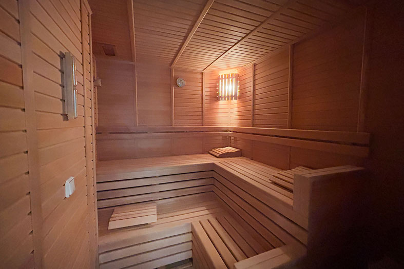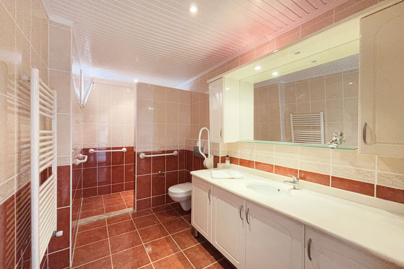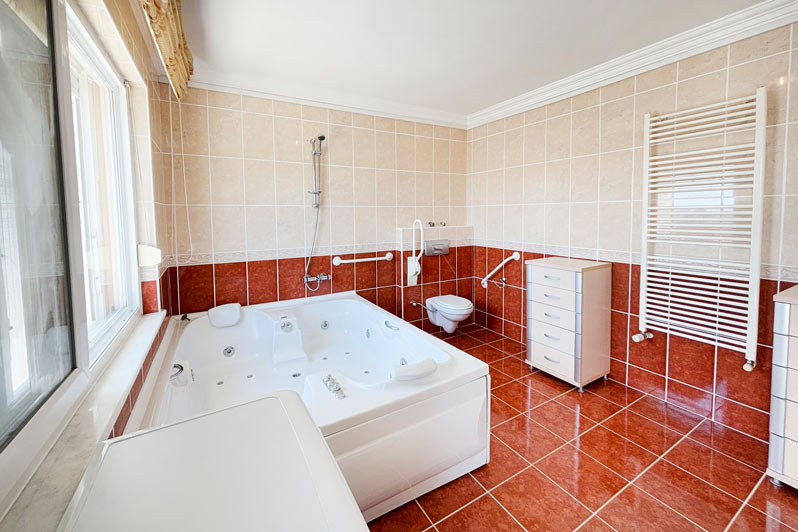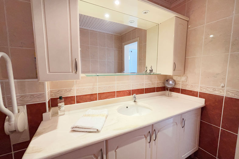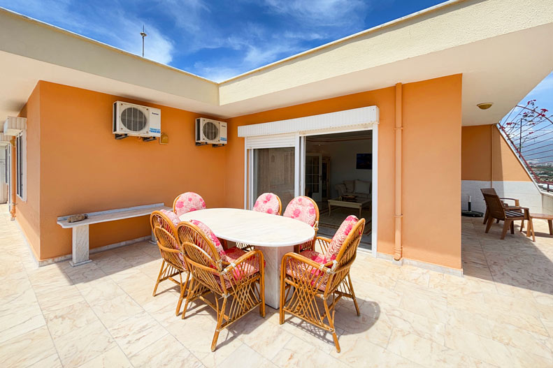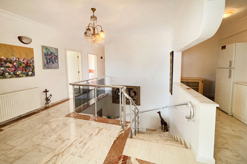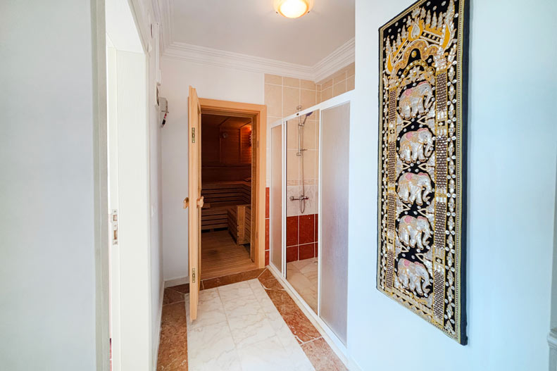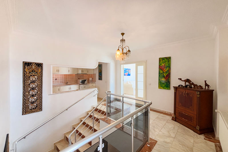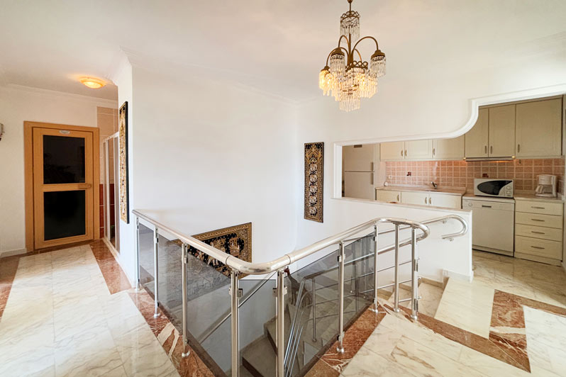 A marble staircase leads up to a wide landing with access to the remaining rooms. Here is another living area with a kitchen, a double bedroom, and a large bathroom with a jacuzzi bath. There is also the luxury of a sauna and shower room on this upper level. The living room opens onto a fabulous sun terrace with panoramic views of the sea and mountains, perfect for entertaining guests at home.