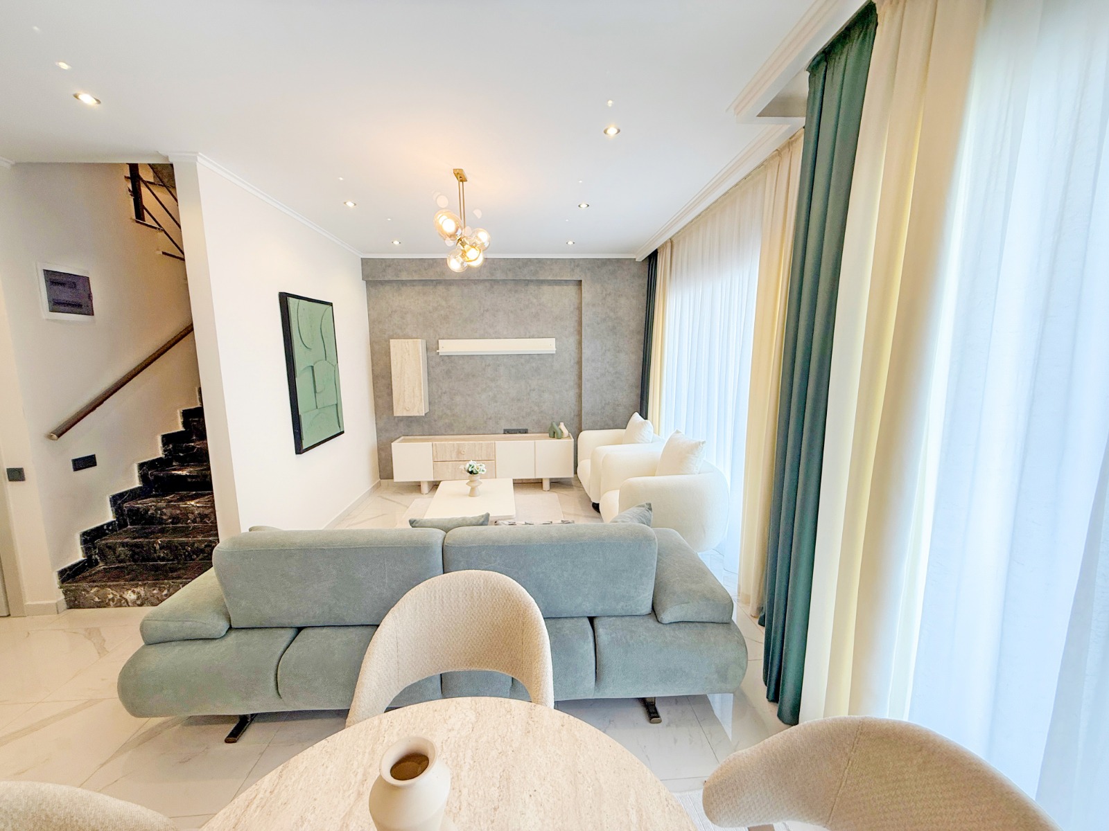 Fully furnished duplex apartment with livingroom with open kitchen, 2 bedrooms, bathroom, guest toilet, 2 balconies with stunning sea and pool views! Complex is a-ma-zing and offers a wide range of amenities as indoor and outdoor pools, Turkish bath, sauna, fully equipped gym etc etc!