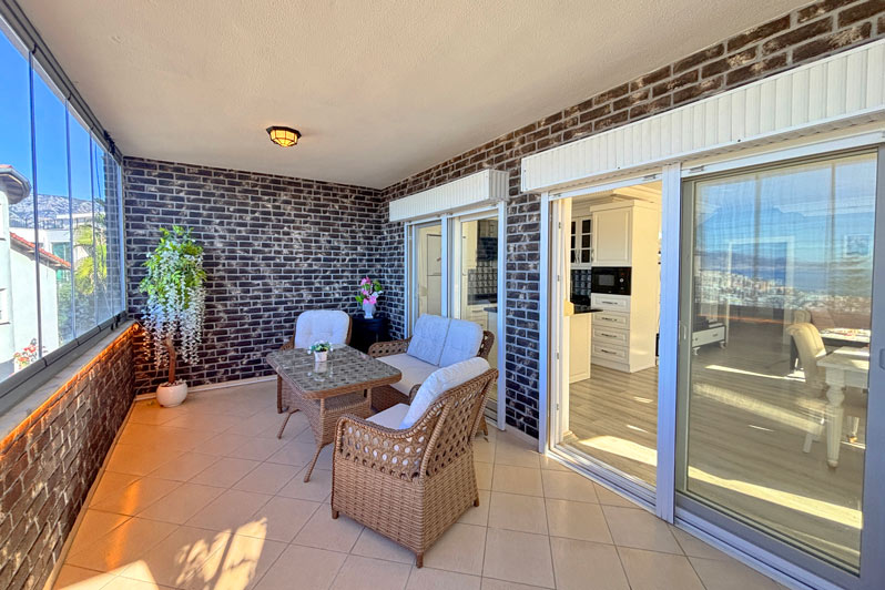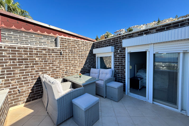 This lovely fully furnished property is in a prime position with an outlook to the coastline. It offers 132m2 of bright open plan space which has been perfectly designed to draw the eye through the length of the living area to the views beyond. There is a compact kitchen together with a spacious and welcoming dining room and lounge. Two sets of patio doors lead onto a wide balcony; the perfect retreat for relaxing, with windows to all sides. On this level, there is also a large guest bedroom and bathroom. A wrought iron staircase leads to the upper floor, where there are 2 double bedrooms tucked in the eaves and a luxurious bathroom. Doors from the master bedroom access a roof terrace - perfect for sunbathing and enjoying the panorama.