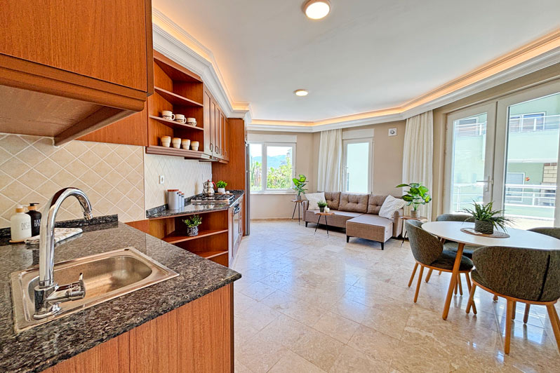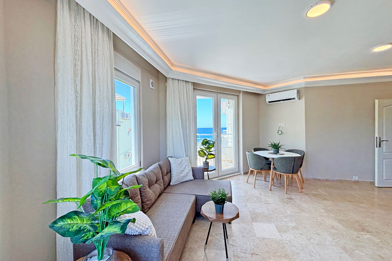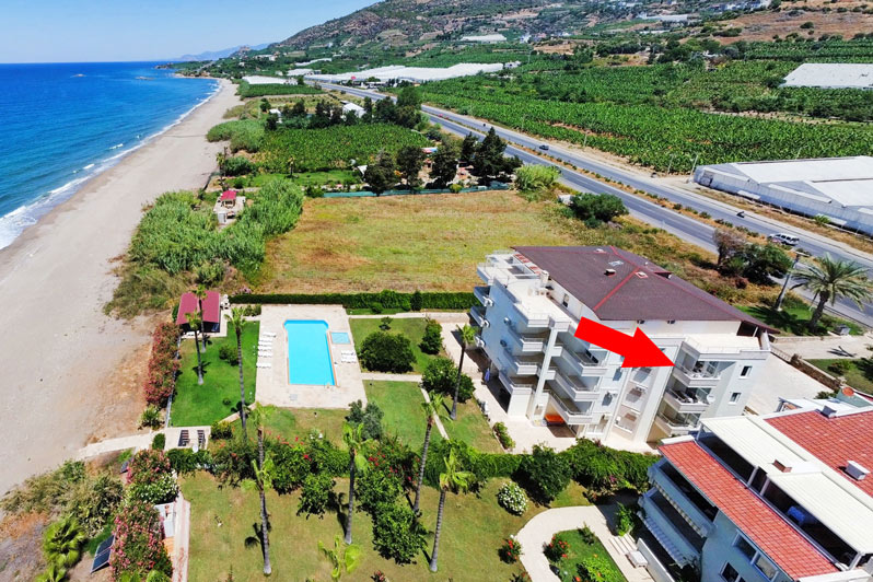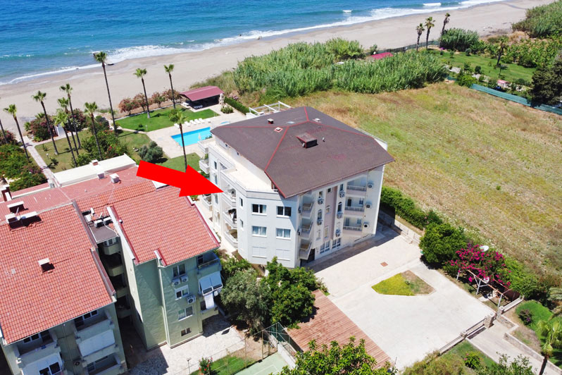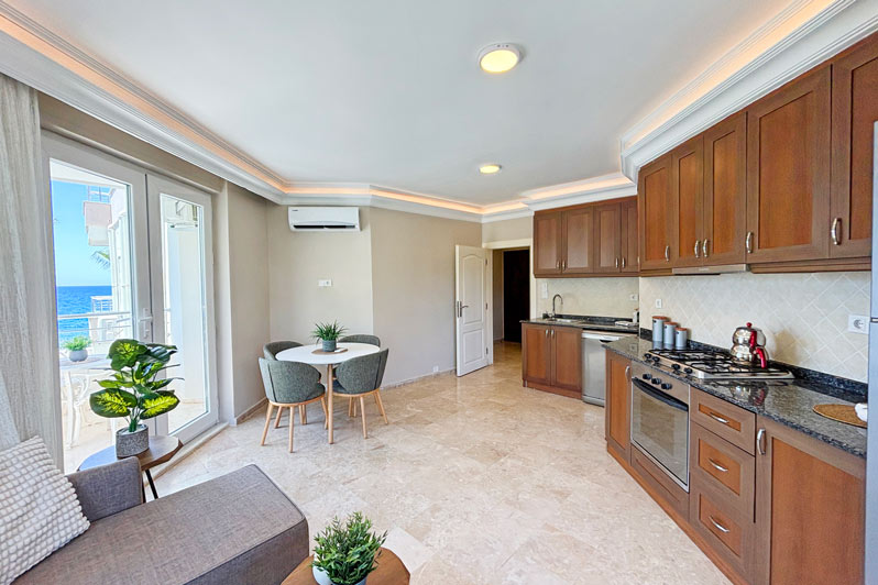 This fabulous 64m2 property is ideally located right on the beach in the peaceful area of Demirtas, between Alanya and Gazipasa. The centrepiece is a bright, homely and spacious lounge featuring a modern kitchen along the rear wall. There is plenty of room for cosy dining and entertaining, and patio doors and windows provide excellent views of the nearby blue sea. Outside, a balcony offers the perfect spot for alfresco drinks and soaking up the atmosphere. A doorway leading back into the entrance hall provides access to a large double bedroom with a private balcony, a smaller bedroom, and a family bathroom.