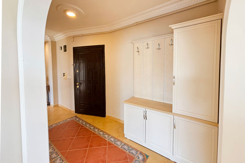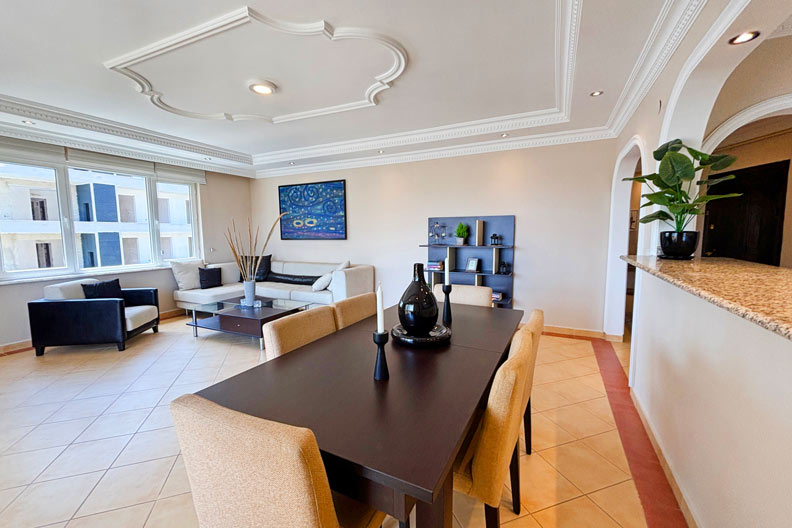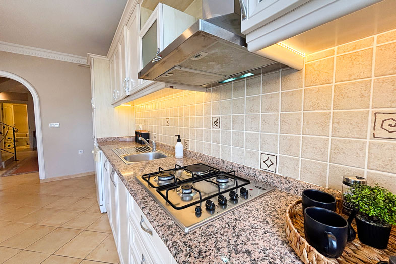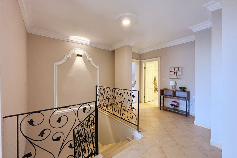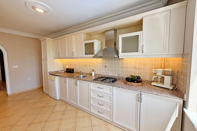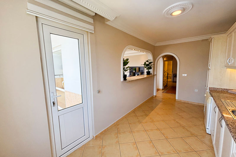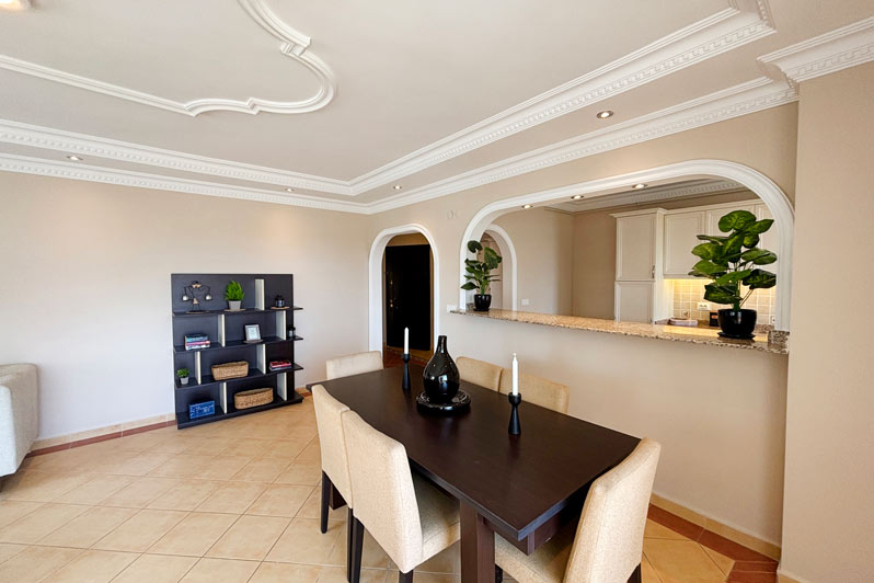 This stunning luxury property spans 210m2 across two levels and is tastefully decorated throughout. Fully furnished, it provides an excellent opportunity for you to modify the use of the rooms or add your own cosy finishing touches. The entrance opens onto the lower level, which features a spacious open-plan living and dining area with an ornate ceiling and wide patio doors. At one end, there is an archway and a long serving hatch that connects to a large, fully equipped kitchen. Outside, a lovely balcony overlooks the pool, making it the perfect spot for relaxation while enjoying the local views.