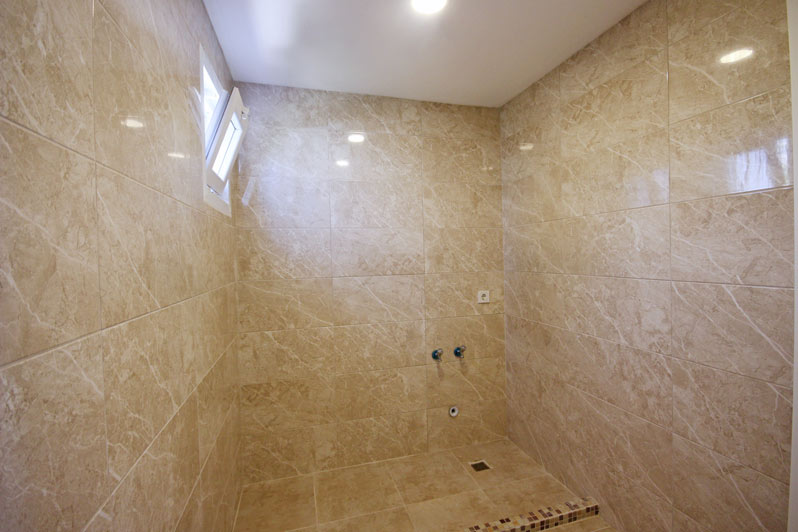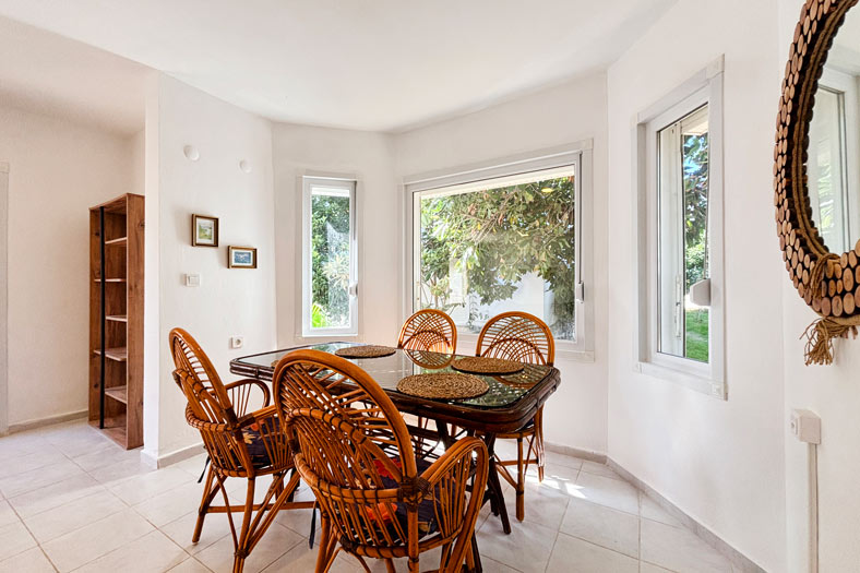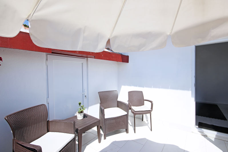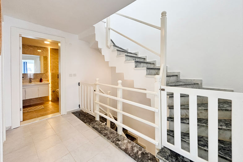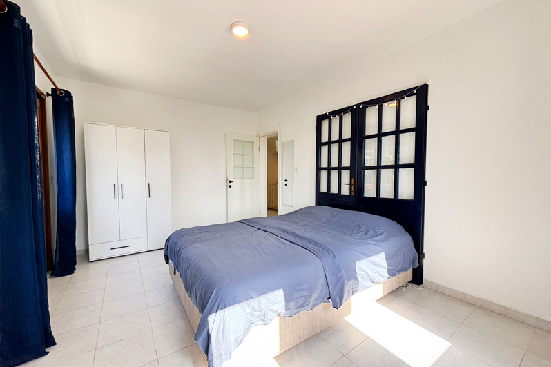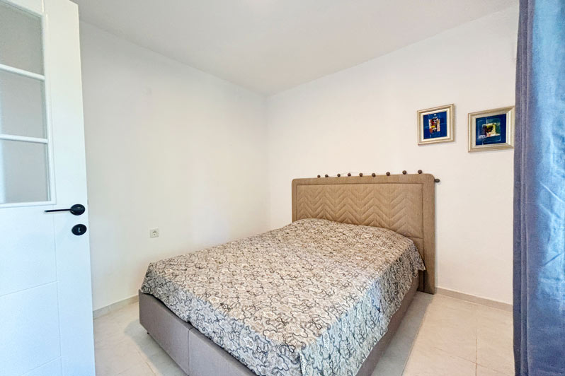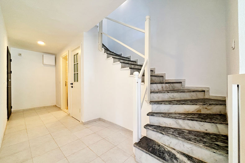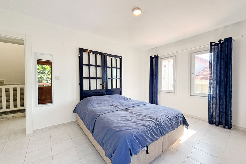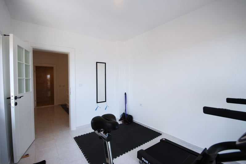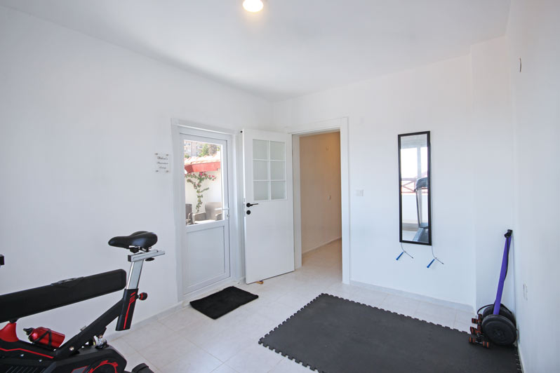 Upstairs, there's a spacious bedroom (now used as a gym) with a private balcony, a bathroom with a shower, and access to a magnificent rooftop sun terrace. Here, you can enjoy breathtaking views of the blue Mediterranean Sea and have access to a convenient storage room.