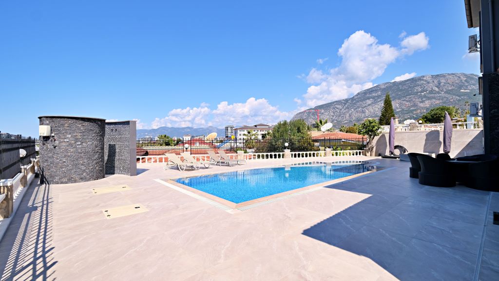 This is a really luxurious property, beautifully designed and furnished, and with a stunning outlook. Inside, there is 250m2 with marble & ceramic flooring throughout, and the layout cleverly blends inside and outside living in a perfect combination. The spacious open plan living area is sunny and relaxing, with lots of windows. There is modern seperate kitchen from Kelebek with all Franke white goods. From here you can go to the wintergarden what has glass around what can be open. On the groundfloor is also good sized double bedroom and modern bathroom with shower.
