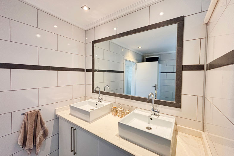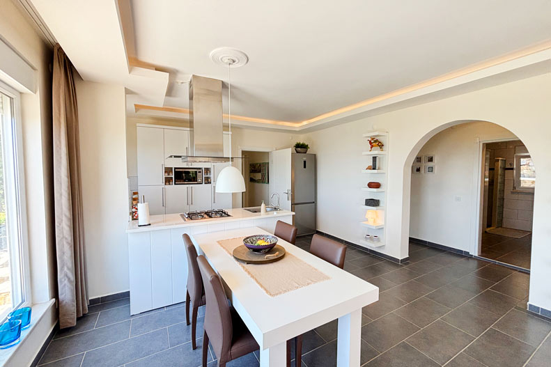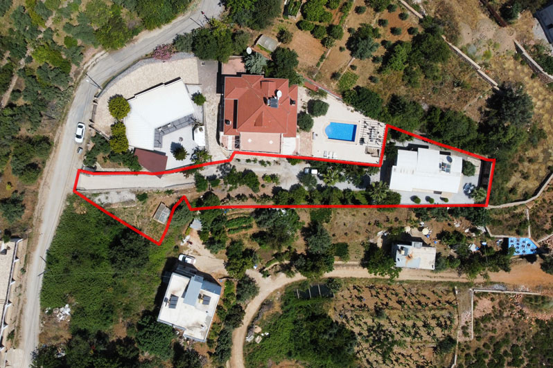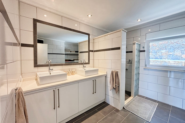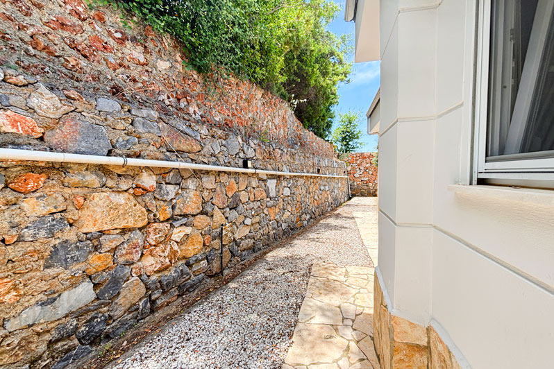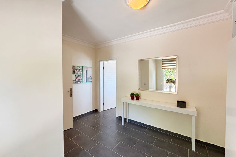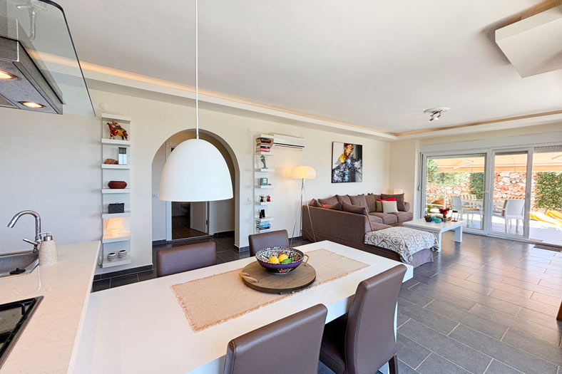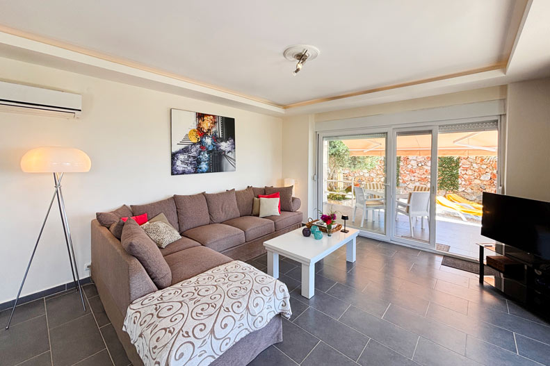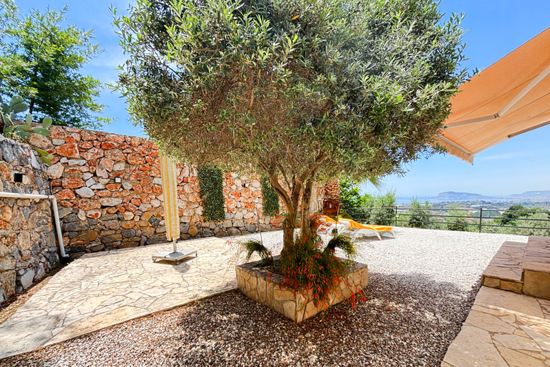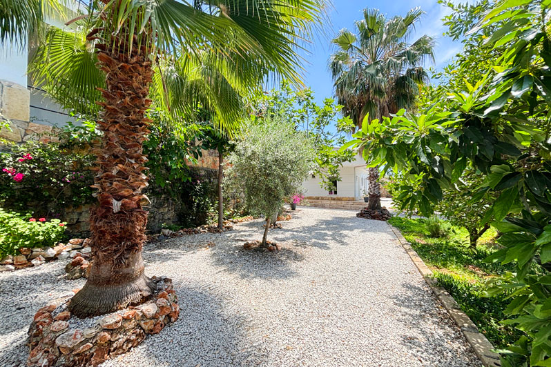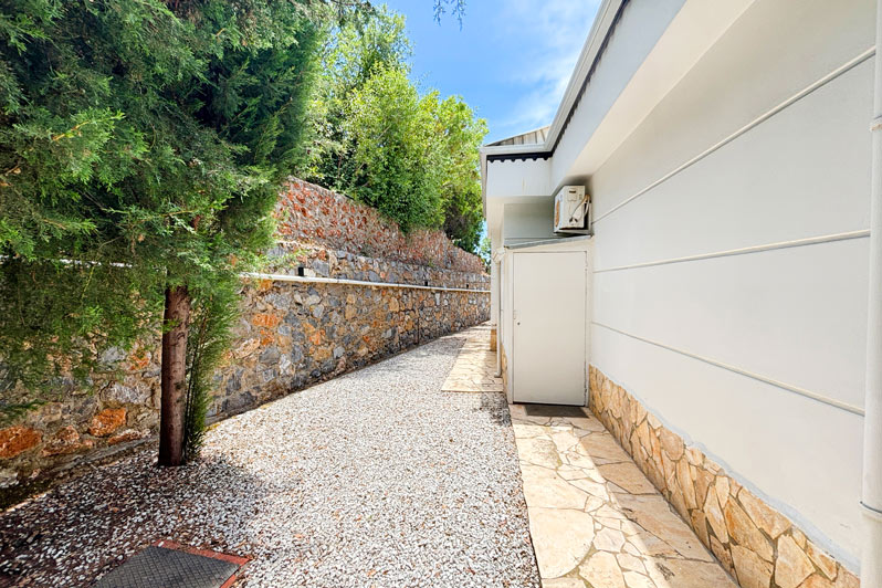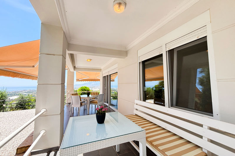 Outside the lounge is an expansive covered patio with additional sun awnings, offering a terrific panorama and perfect for al fresco meals. Its vast space and cosy seating areas make it the ideal place to laze the days away or entertain friends. There is also a private sunbathing area at the front with enough room to install a swimming pool. Fully paved and landscaped around the villa, to the rear is a beautiful, large garden area which runs alongside the entrance driveway. It could be utilised in many creative ways and efficiently used to grow fresh vegetables and fruit trees.