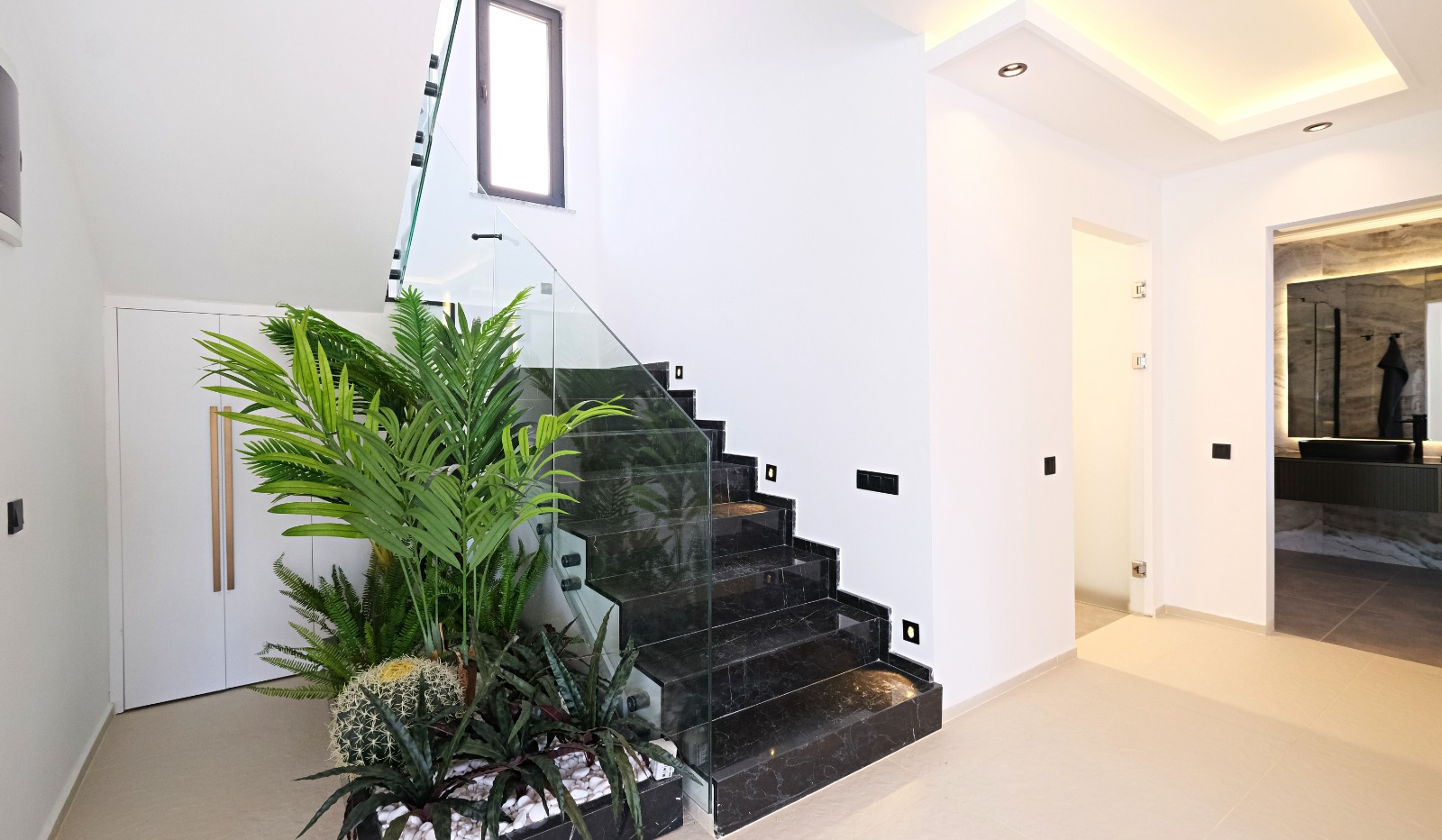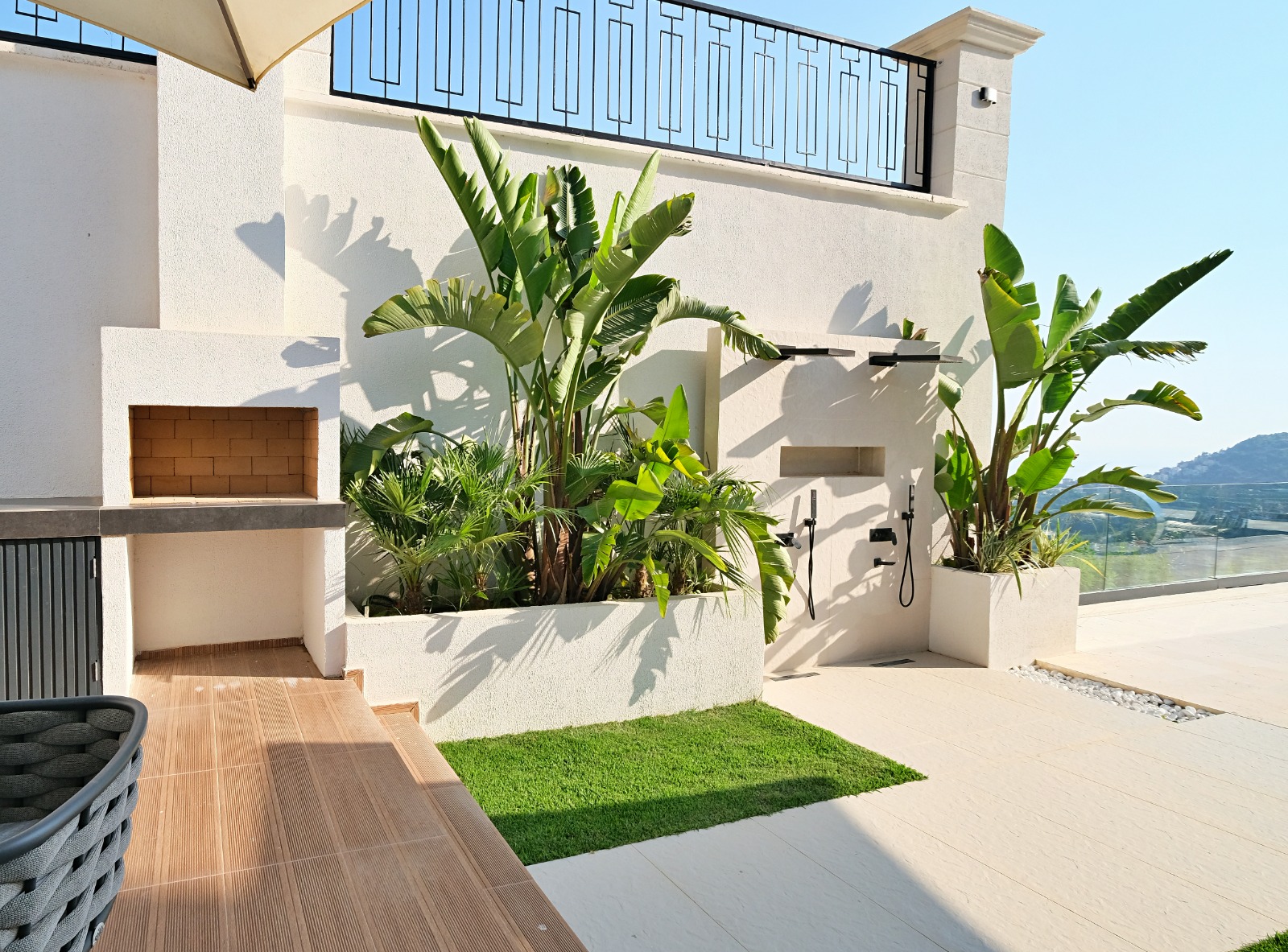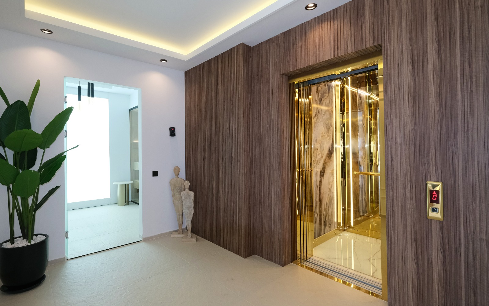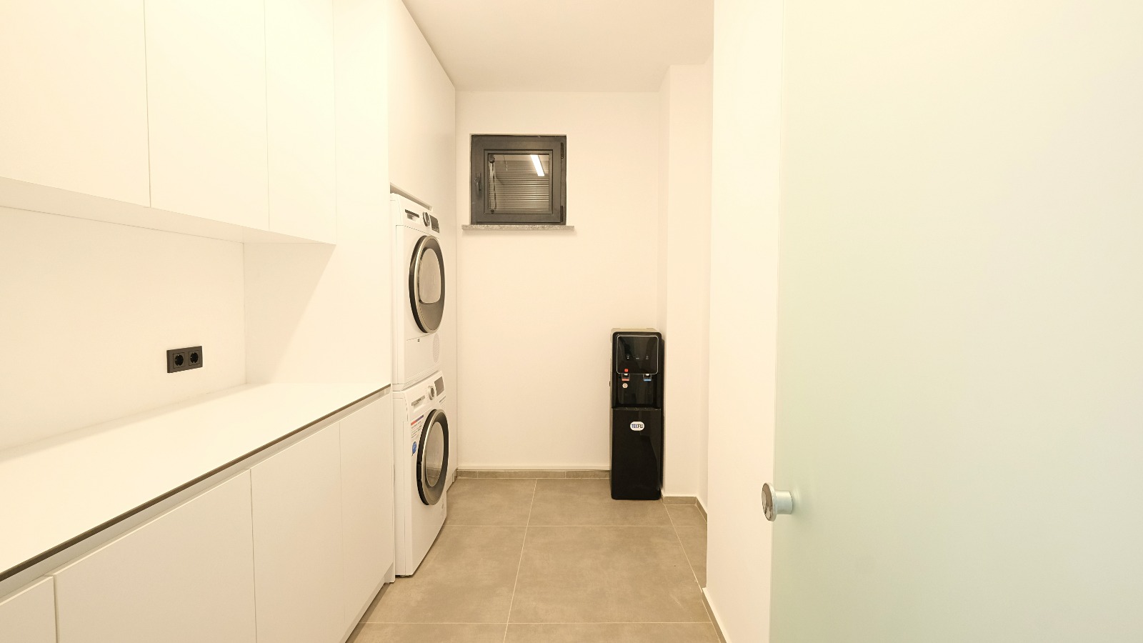 This amazing fully furnished brand new premium villa has 2 livingrooms, fantastic modern open kitchen with dining area, 3 bedrooms (2 with walk in wardrobe), 4 bathrooms, 3 balconies, sport area, sauna, amazing huge roof terrace and is build in 4 floors! You can take the stairs but of course you have your own elevator in this villa!