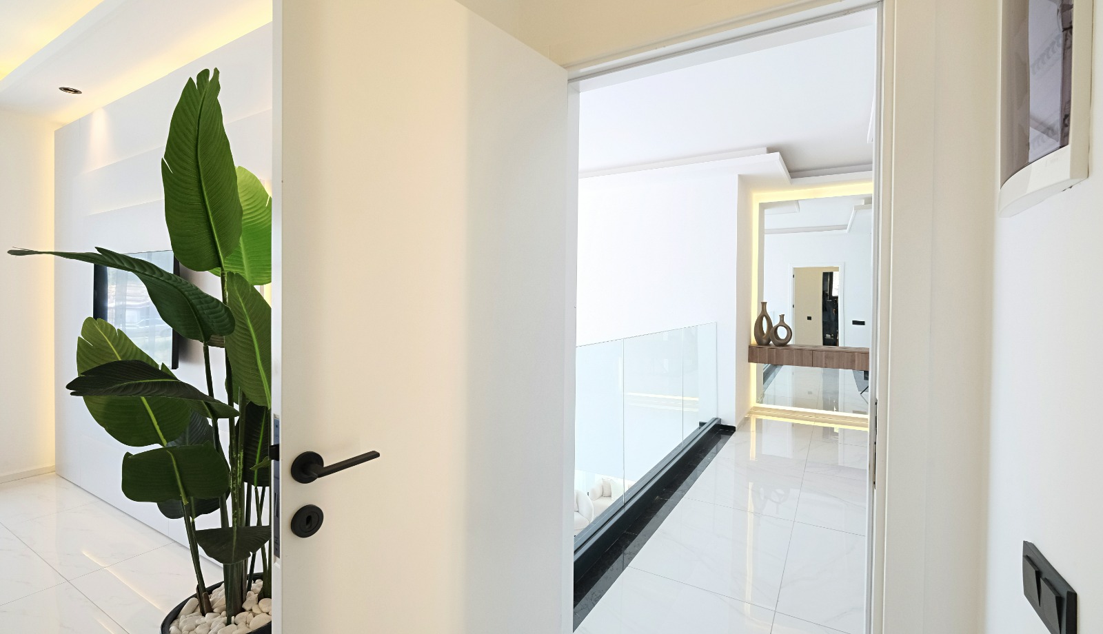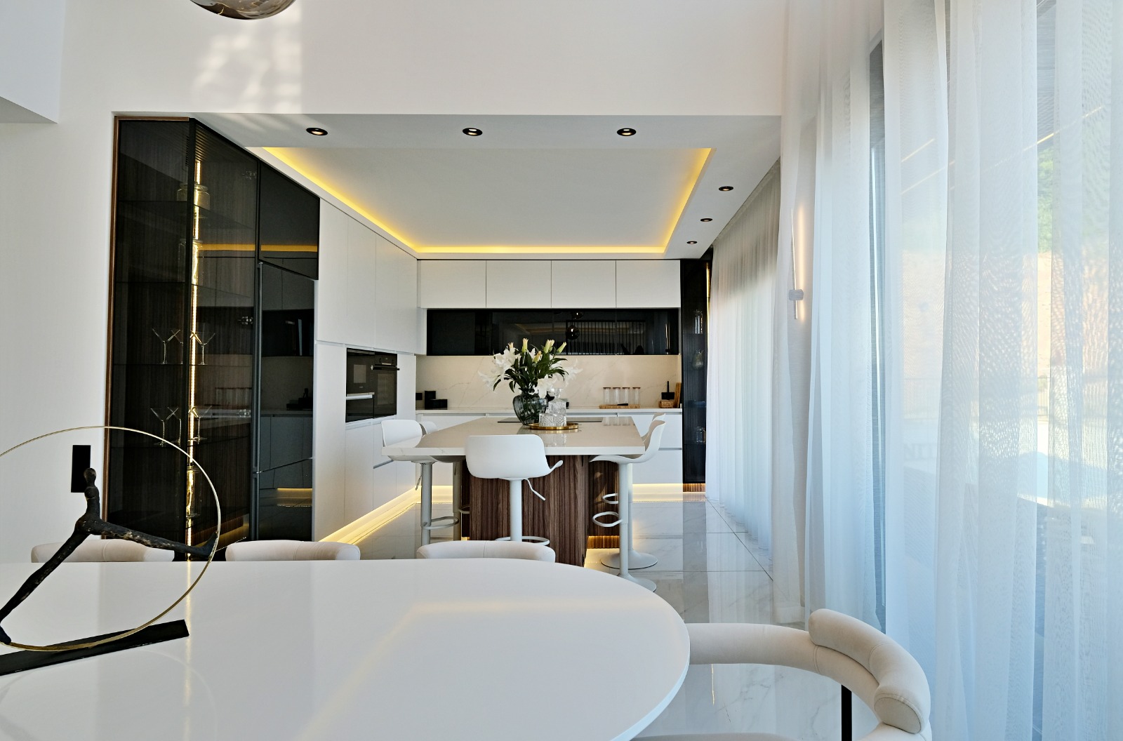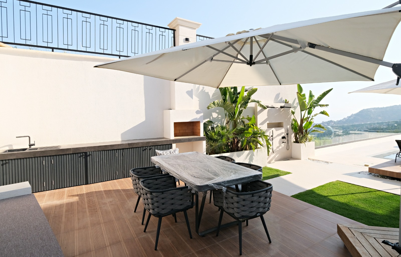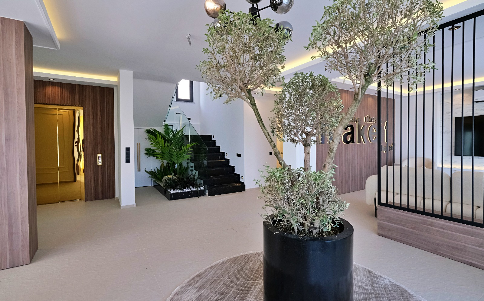 This amazing fully furnished brand new premium villa has 2 livingrooms, fantastic modern open kitchen with dining area, 3 bedrooms (2 with walk in wardrobe), 4 bathrooms, 3 balconies, sport area, sauna, amazing huge roof terrace and is build in 4 floors! You can take the stairs but of course you have your own elevator in this villa!